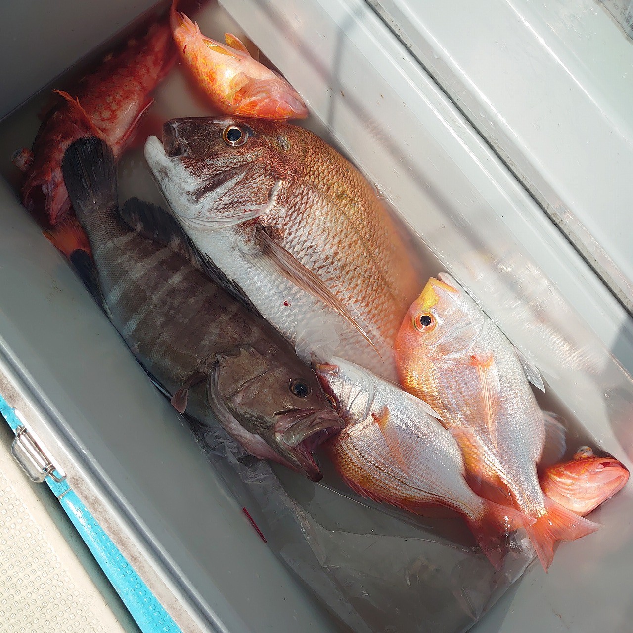 真鯛や根魚、船長がタモ入れ失敗しましたが、ブリも釣れてました(泣)